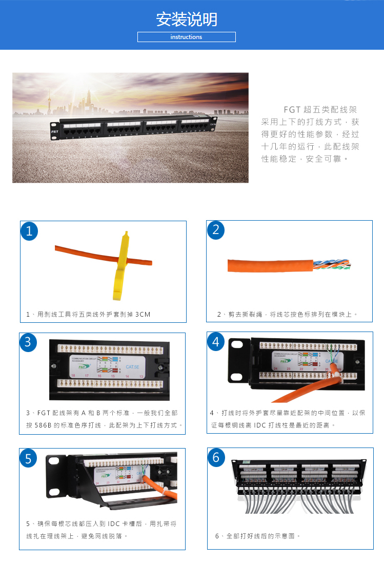 CAT .5e UTP patch panel Implementation standards: YD/T 926.3, ISO/IEC 11801, ANSI/TIA-568.2-D. Support voice communication system, 10BASE-T, 16Mbps, 100BASE-T, 155Mbps and 622 Mbps ATM, 1000 Mbps, multimedia and other high-speed applications.