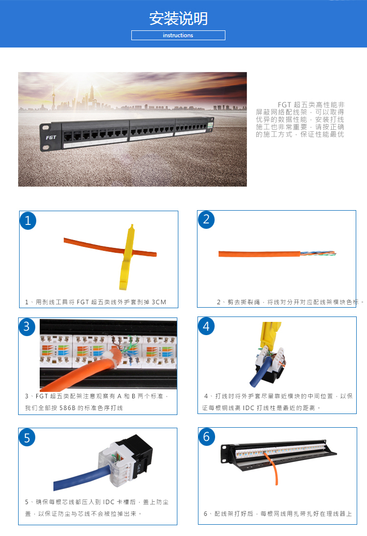 CAT .5e UTP patch panel Implementation standards: YD/T 926.3, ISO/IEC 11801, ANSI/TIA-568.2-D. Support voice communication system, 10BASE-T, 16Mbps, 100BASE-T, 155Mbps and 622 Mbps ATM, 1000 Mbps, multimedia and other high-speed applications.